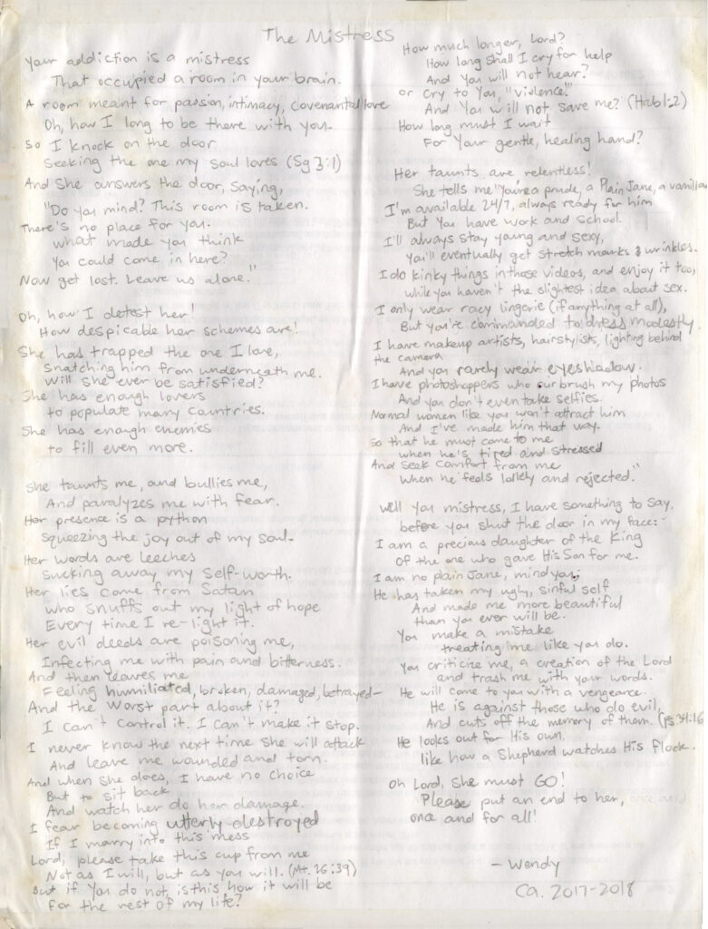 A bed is in the middle, and it’s filled with images of women, representing the women my husband may have seen in porn. It has made me wonder if there’s any room in his head (or his bed) for me.